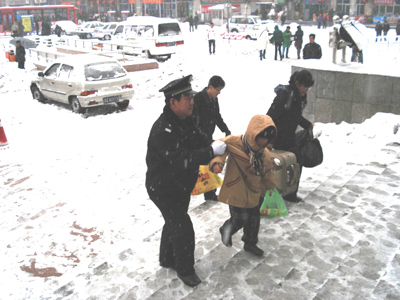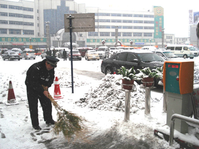 民警为汽车道扫雪
