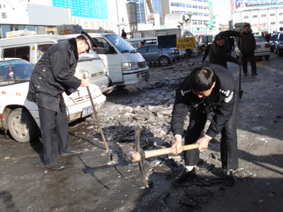 民警们正在为便道除冰
