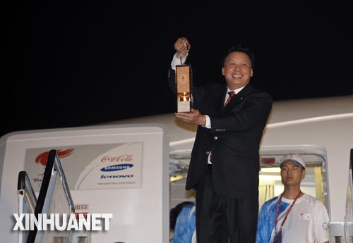 5月2日,北京奥组委执行副主席杨树安手持火种灯走下飞机。新华社记者刘莲芬摄