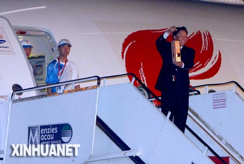 5月2日,北京奥组委执行副主席杨树安手持火种灯走出机舱。当日,搭载着北京奥运会圣火的专机抵达澳门。新华社记者戚恒摄