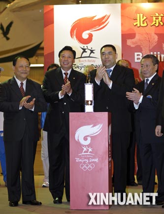 5月2日,北京奥组委执行副主席杨树安(左二)、澳门特区政府社会文化司司长崔世安(右二)等在欢迎仪式上。新华社记者戚恒摄