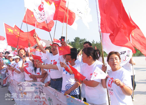 鄂尔多斯市市民激情四射地为奥运火炬加油,为北京奥运高呼呐喊。记者赵文萃 摄