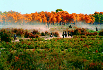 每年十月份,随着金秋来临,胡杨树叶逐渐由绿色变为浅黄、深黄、金黄,一眼望去,阳光下金色的树叶映衬着湛蓝的天空,呈现出亮丽的色彩,使无数中外游客和摄影爱好者流连忘返。