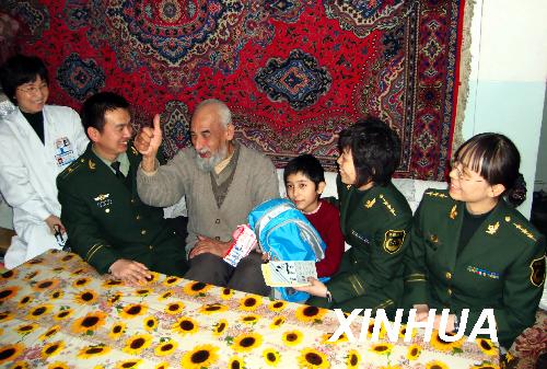 近日,武警新疆边防总队医院抽调10余名专家和业务骨干深入社区、敬老院、商贸市场展开“学雷锋日”义诊活动,并组成医疗小分队到医院驻地辖区十多户帮扶对象家中,为群众上门服务。(王直摄)
