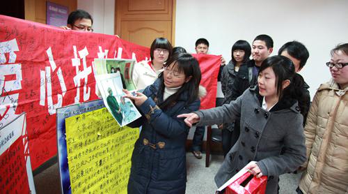 阿依努尔的同班同学胡雯、向华为同学们慢慢展开了那条曾在南开大学校园和天津滨江道的捐赠现场悬挂的红色条幅,上面签满了热心人的名字。她们还一边展示阿依努尔手术成功后走出隔离仓的最新照片,一边把救助行动中的故事将给大家听。