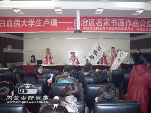 3日下午,由中国农工民主党内蒙古自治区委员会和内蒙古社会扶贫工作促进会主办的“救助白血病大学生卢珊——自治区名家书画作品公益拍卖会”在呼和浩特召开,内蒙古26位知名书画家的147幅作品共拍得30200元,拍卖款项现场全数捐给身患白血病的大学生卢珊。